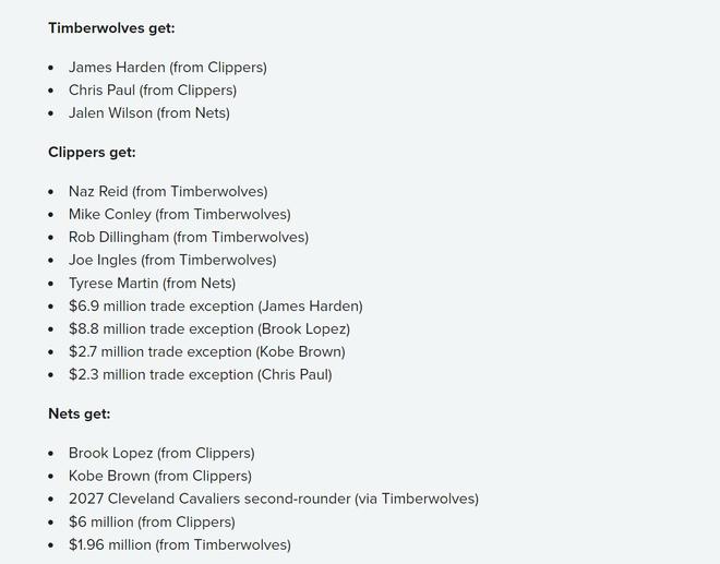 快船得到:里德+康利+迪林厄姆+英格尔斯+泰瑞斯-马丁+690万交易特例(来自哈登)+880万交易特例(来自大洛)+270万交易特例(来自科比布朗)+230万交易特例(来自保罗);