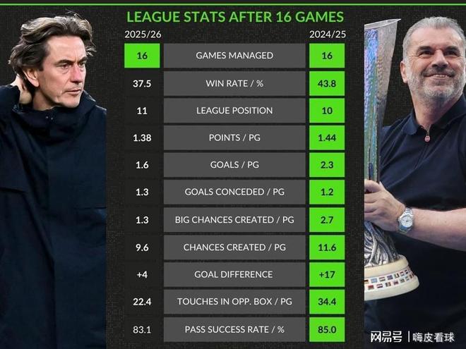 稍早开赛的热刺令人失望,客场惨败诺丁汉森林,虽然排名没有变化,但是距离前面的球队越来越远。两个月前,热刺排在英超第三名,距离榜首阿森纳只有2分,如今落后多达14分。统计表明,同样是16轮,弗兰克所有数据均比上赛季的波斯特科格鲁更差,难道又直奔保级区而去?